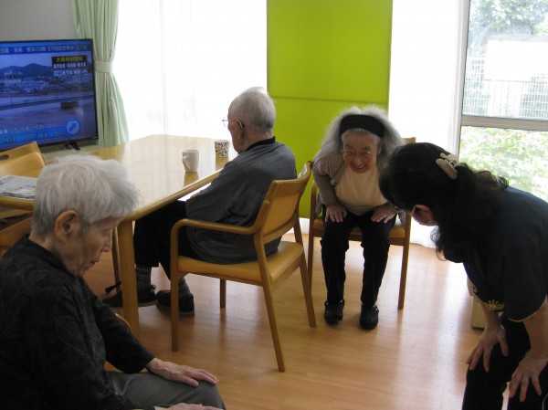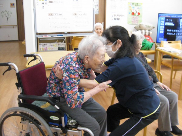 車椅子の方は支えて立ち上がられている様子です。筋力維持になればと思い日々行っています。「悪いね!!」と(笑)