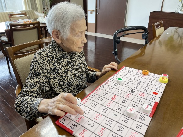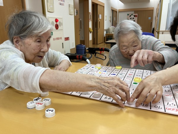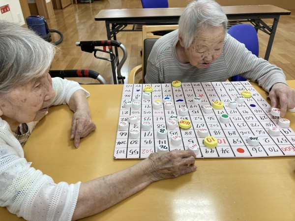 ボード、ペットボトルキャップに1~100までの数字が貼ってあり、数字を合わせて並べていくゲームです。 女性の利用者にも男性の利用者にも人気が高く、皆さますごい集中力で取り組んでくれます。 脳の運動(数字合わせ)と指の運動(指でつまむ)を同時に行うので認知症予防として注目されています。