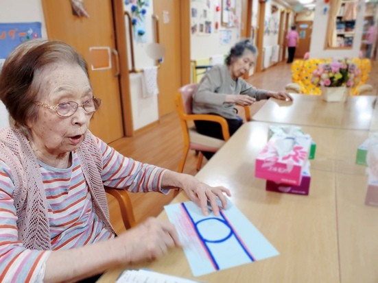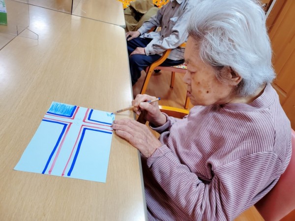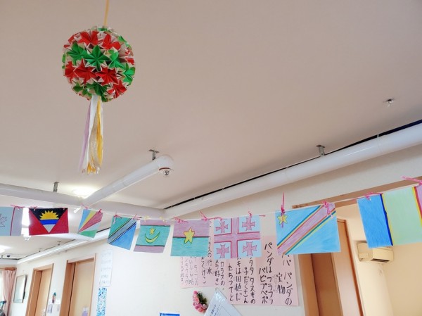 こちらの万国旗、ひとつひとつが利用者様とケアスタッフの手作りです!