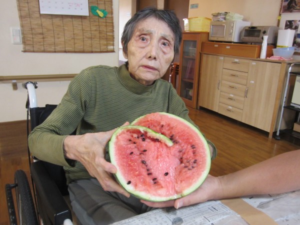 割ったスイカを「美味しい」「美味しい」と召しがっていました。