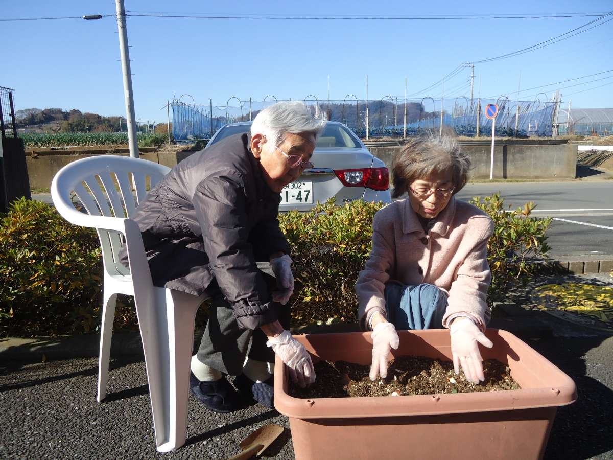 スコップで土の上を掘り、きれいに咲くかなー、何色の花かな~と