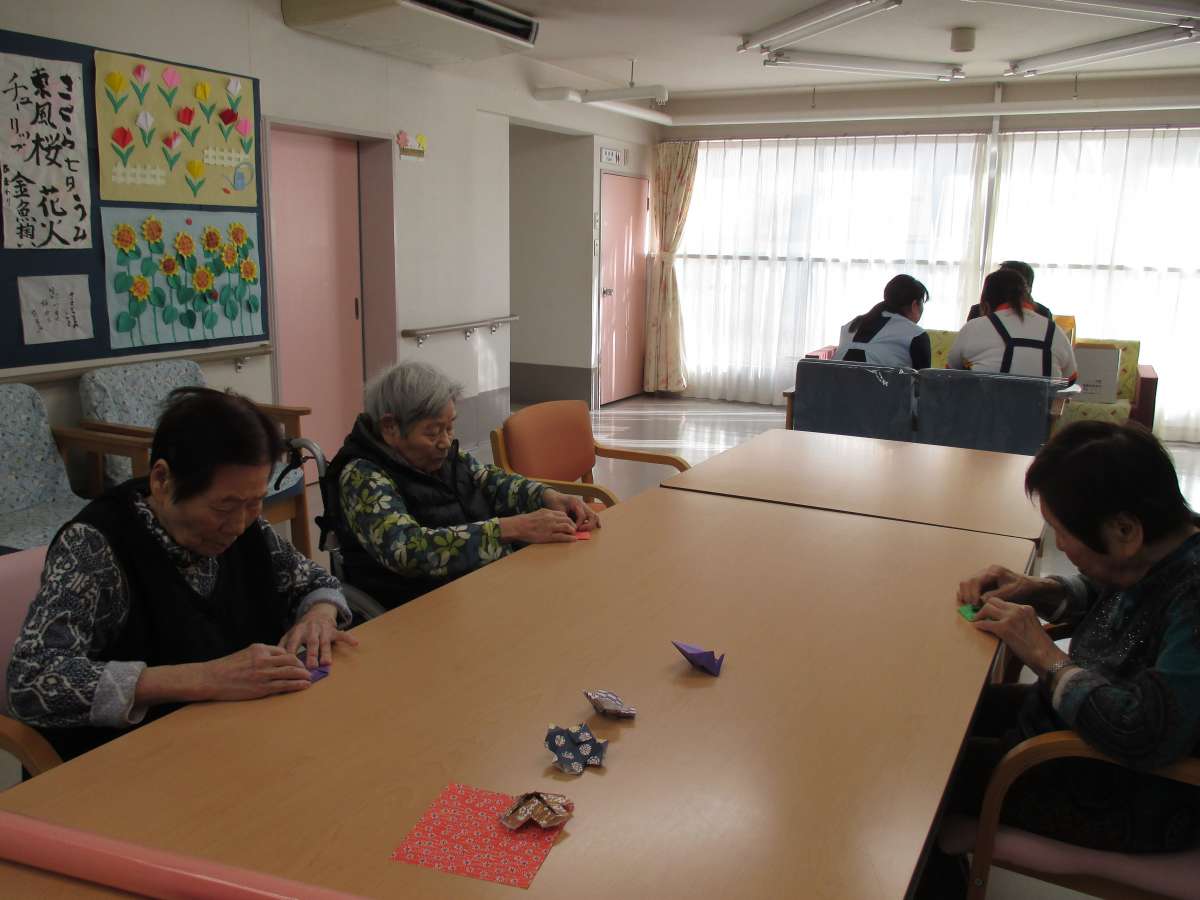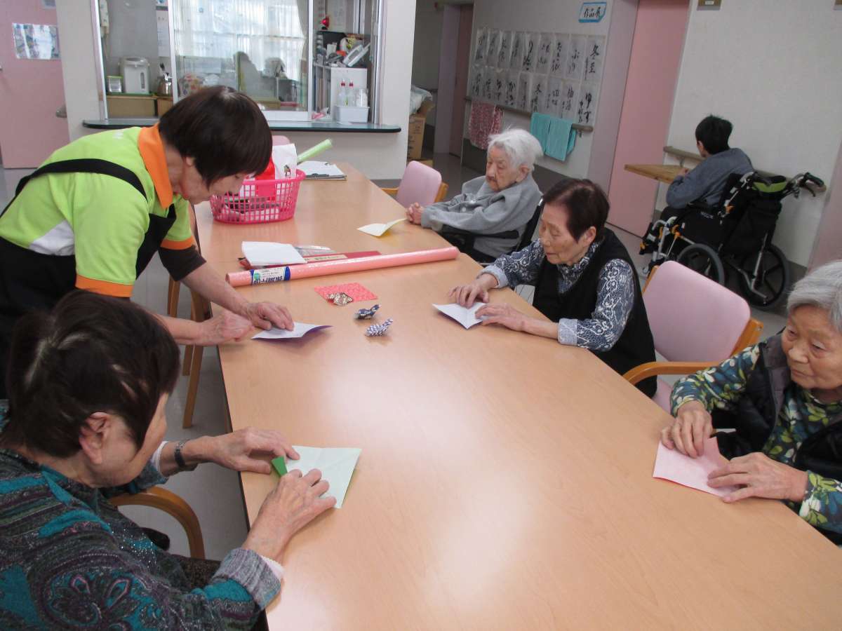 レク担当職員に教わり折り紙で「やっこさん」を作成中