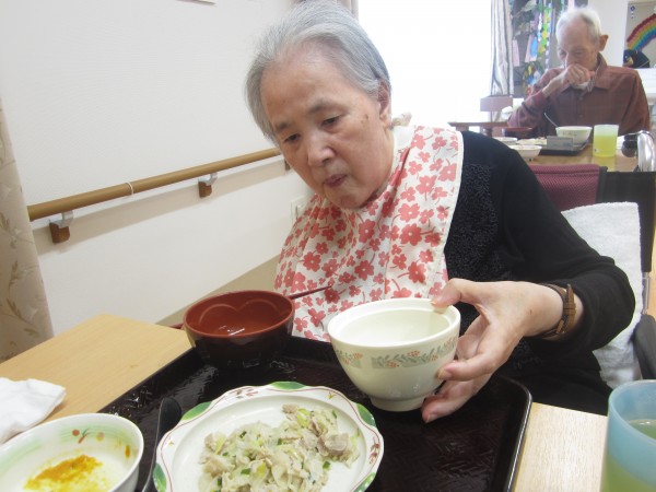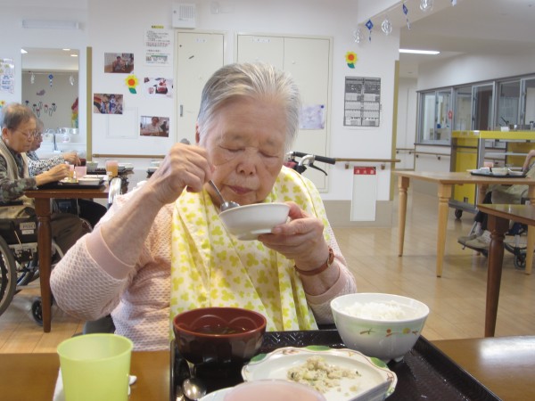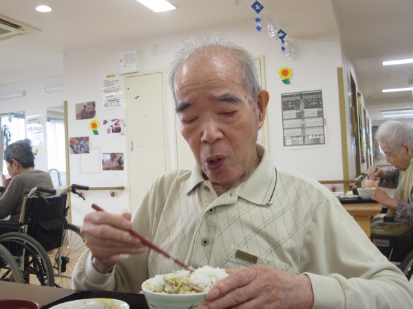 ご利用者様は昼食前の日課のラジオ体操・アルソック『ALSOK』体操・口腔体操後の昼食で、