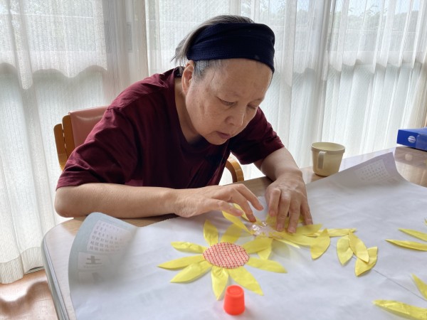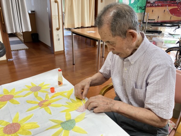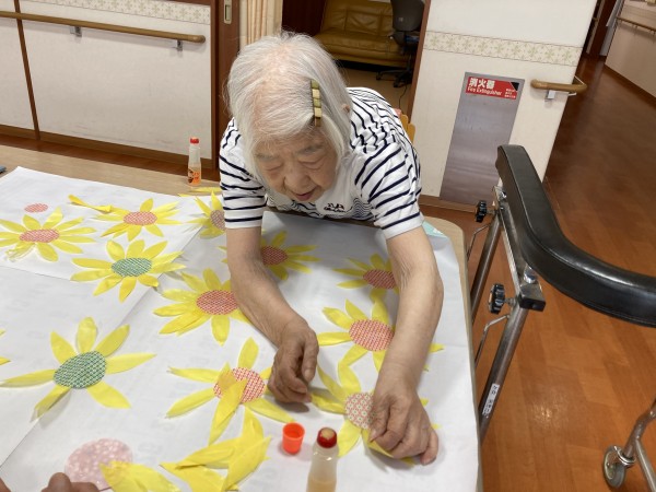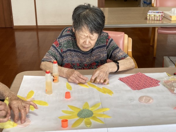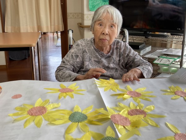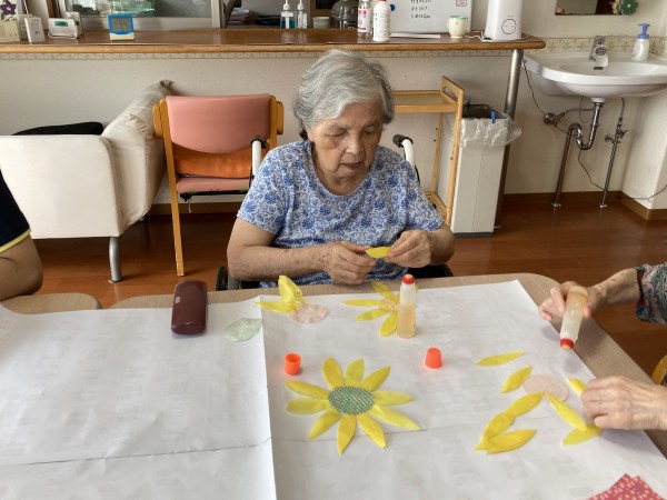 真剣な表情ですが、利用者様同士で中心にくる色は「どんな色がいいかしら?」「まわりは黄色だから茶色よね」「のりが手についちゃって大変よ!」