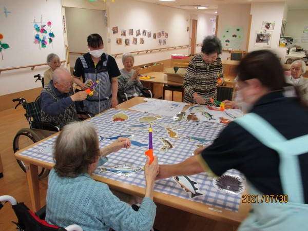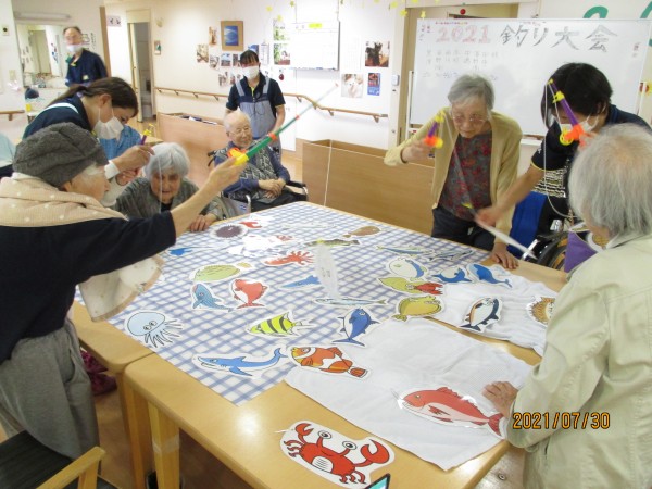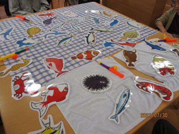 魚釣り大会の開催です! アジ、サンマ、サケ、いろいろな魚がたくさん泳いでおります。よく見るとサメ、クジラ、イルカ、ジンベイザメまでいますよ。本当にこんな魚が釣れるんでしょうか・・・・・・・?