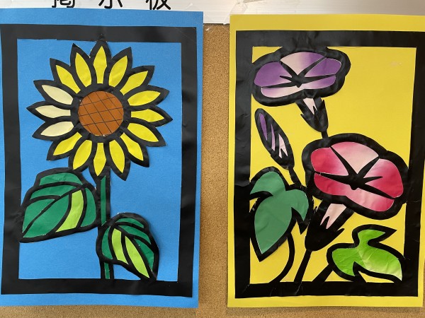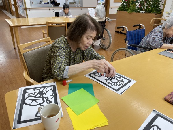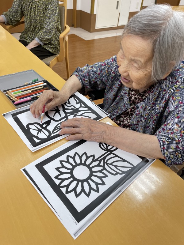 夏場の花といえばひまわりですが、ひまわりの塗り絵を皆さまで塗るも良し、貼り絵にするも良しのフリータイムでございます。