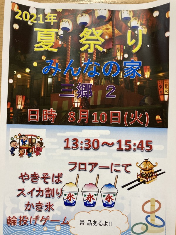 三郷2の恒例行事、納涼祭が今年も開催されます!スタッフの太鼓演奏による盆踊りやスイカ割りはもちろん、他にも楽しい企画や美味しい料理をたくさん用意しております!