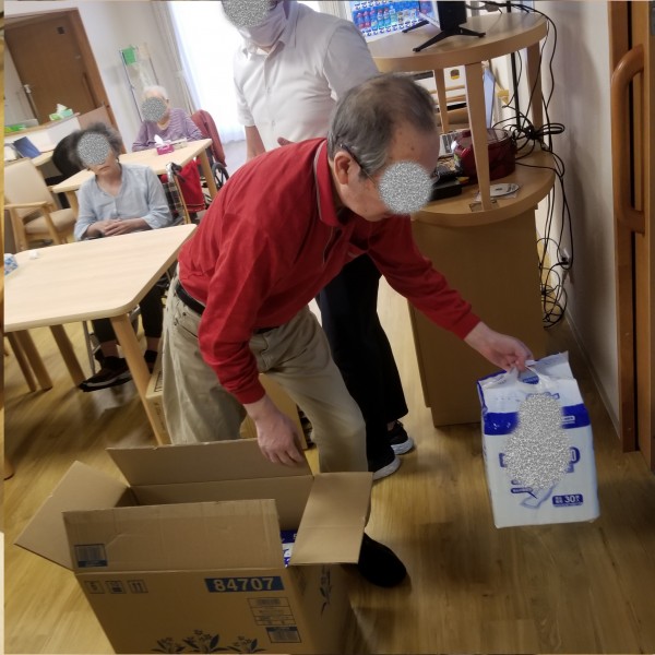 こんにちは。男性ご入居者様が荷物の仕分けをお手伝いしてくださいましたよ