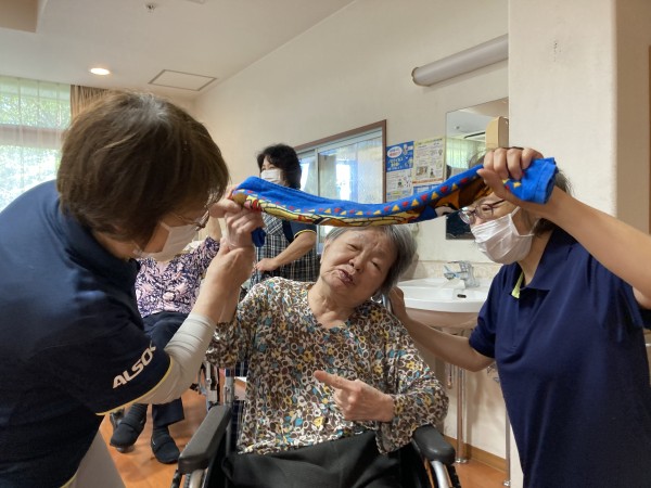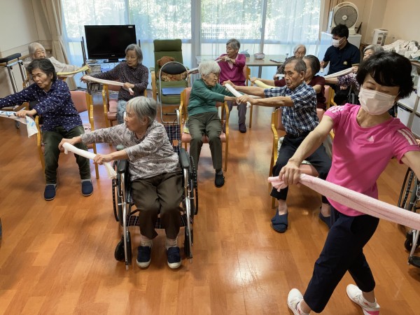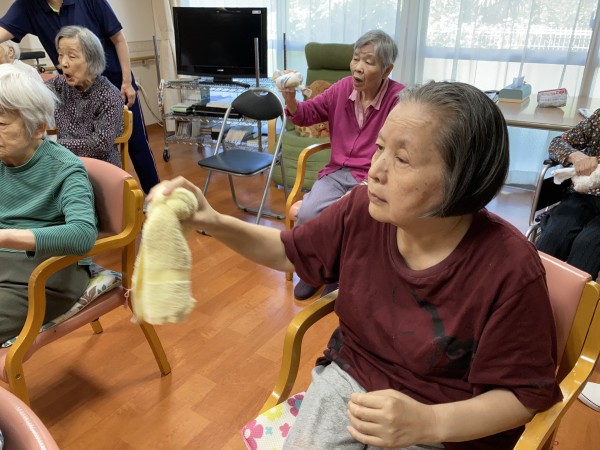 岡庭講師の声かけに背筋を伸ばしたり、腕を上げたりと初めてのタオル体操でしたが、
