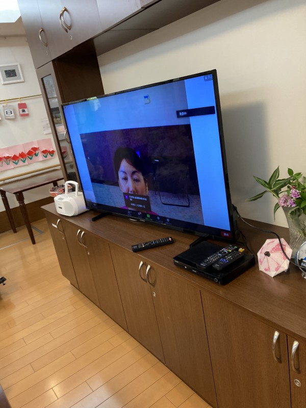 コロナ禍で体を動かかす機会があまりありません。しかしそんな状況下で、少しでも身体を動かす機会が持てるようにと始まったリモート運動教室。毎月定期的に体操インストラクターが来てくれますが、今回は安全を図りビデオ会議システムを使用しインストラクターの先生と他施設をリモートで繋ぎ、様々な施設と共に体操を行う事が出来ました。TV画面に映っている体操インストラクターの先生を見て、皆様一緒に体操を行いました。