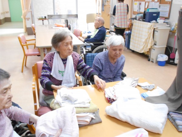 洗濯物を乾かした後、入居者様に畳むのを手伝っていただいています。