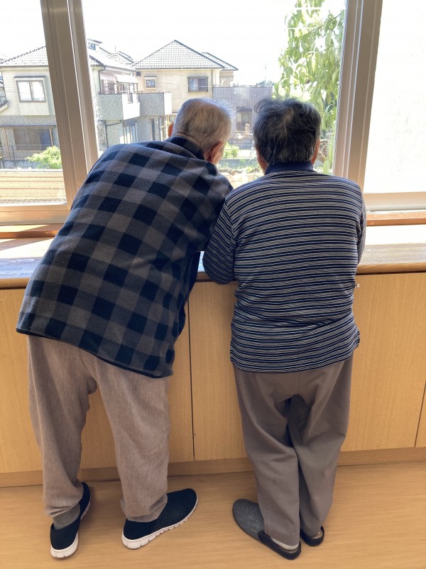 今日の午前中、花桃の木を眺める2人の姿が…!先日,職員が剪定したのですが、気になるご様子でして、楽しそうに様子を見ながらお喋りされていました。
