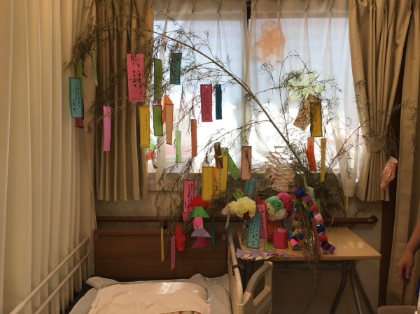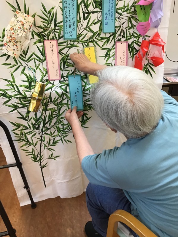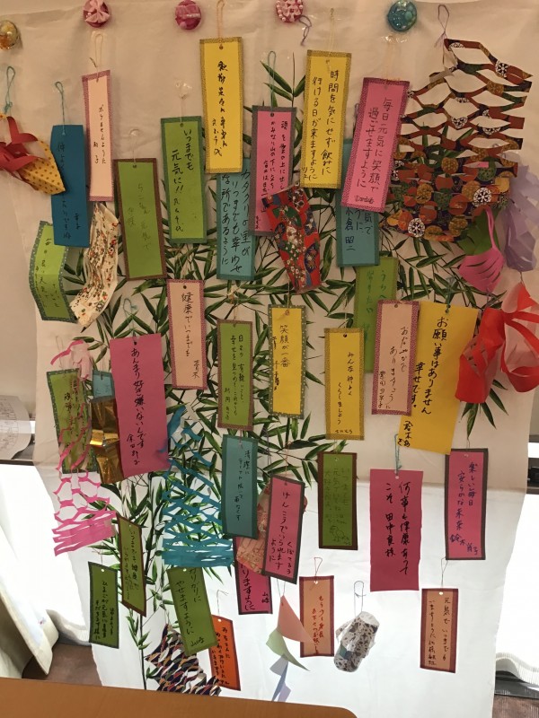 今年は、お2階に引っ越してきた、かたくりの里多摩川から生の笹の葉をいただいたので、皆さんに短冊を書いていただき、飾りつけをしていました。