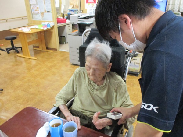 本日は、利用者様皆さんの体調を確認する、バイタル測定中の様子を
