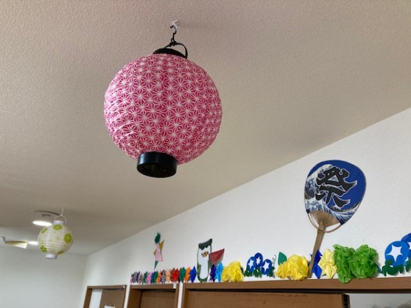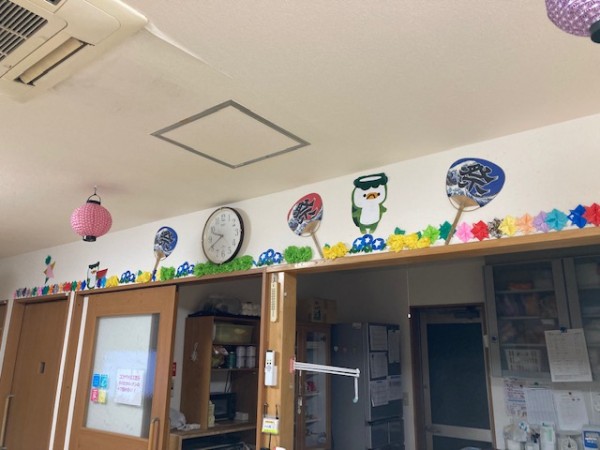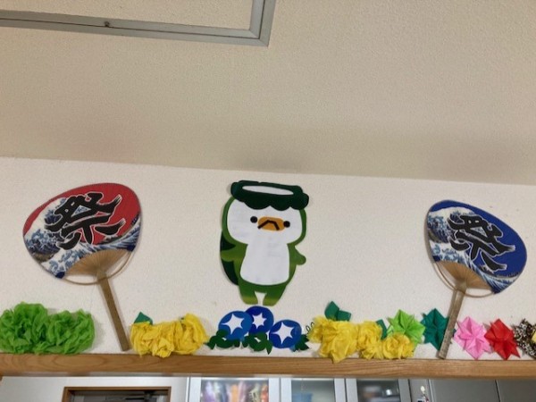天井には提灯がぶら下り、壁には祭りの旗が掲げられ、そして上の方にはうちわとアサガオと、、