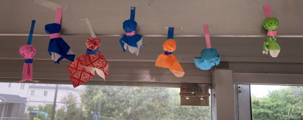 材料を用意していたわけではないので、折り紙をうまく使って作ります。