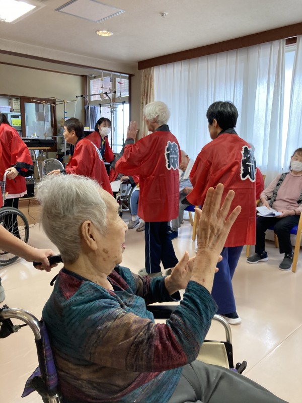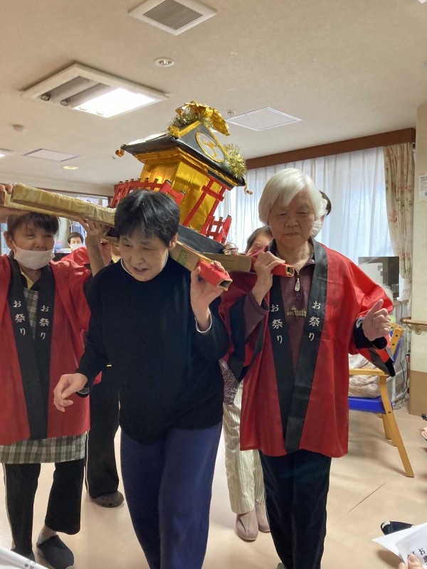 赤いはっぴに身を包み、手作りのお神輿をかついだり、盆踊りを踊ったりと生き生きと楽しそうにお祭りに参加されていました!