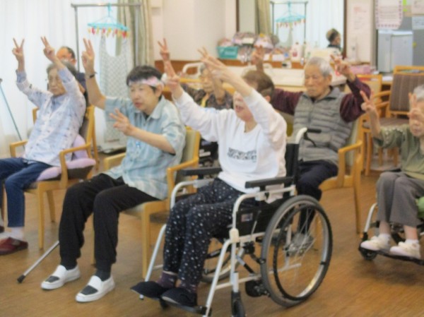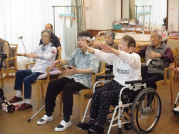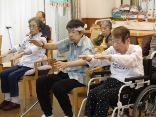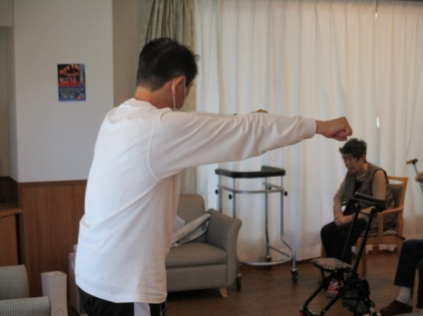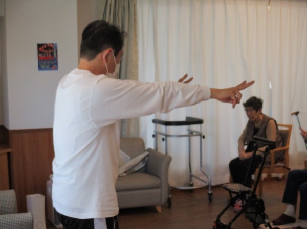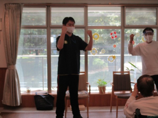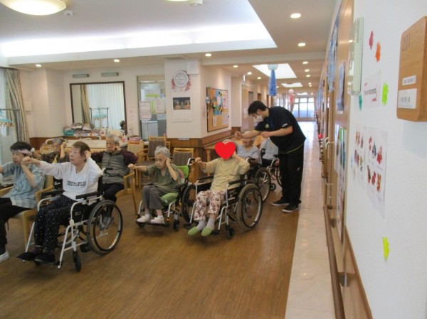 スタッフも一緒にやります。上手く出来ない利用者様に優しく見本を見せています。
