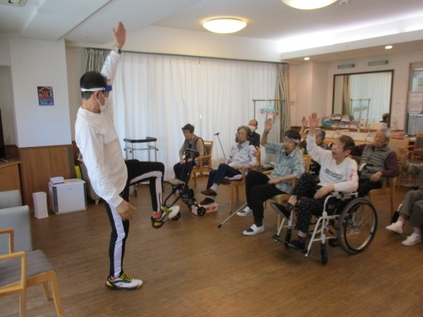 岡田トレーナーの掛け声に合わせ、同じ動きをします。目と脳と身体を同時に使います。