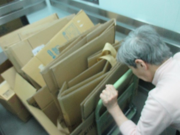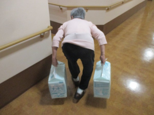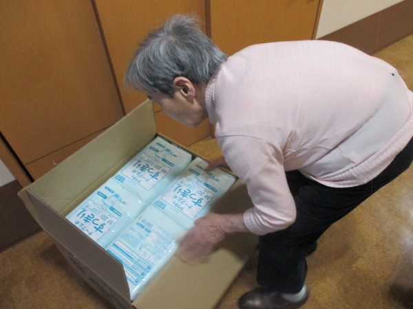 いつもお手伝いして下さる利用者様、今日はオムツをダンボールから出して下さる