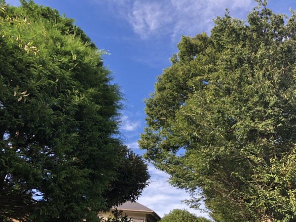 下の写真は、わたしたちのホームの近くにある『かすみ堤』(多摩川の旧堤防)の傍に生えている二本の大木の隙間(すきま)から青空を眺めたものです。・・・長く・激しい雨で木々はたっぷりとうるおい、昨日の晴天で今度はたっぷりと光を浴びて、いかにも気持ち良さそうです。