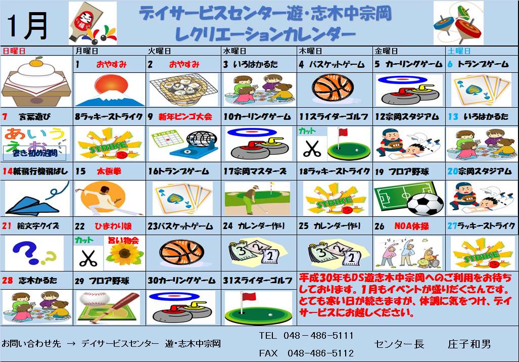 デイサービスセンター 遊 ・志木中宗岡の1月のレクリエーションカレンダーです。是非見学にお越し下さい。