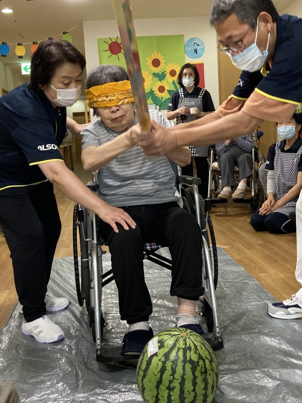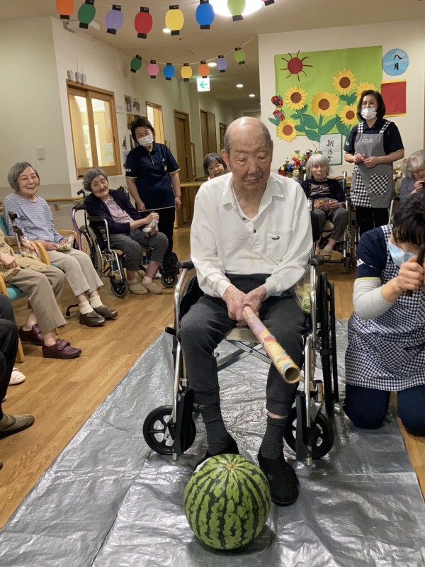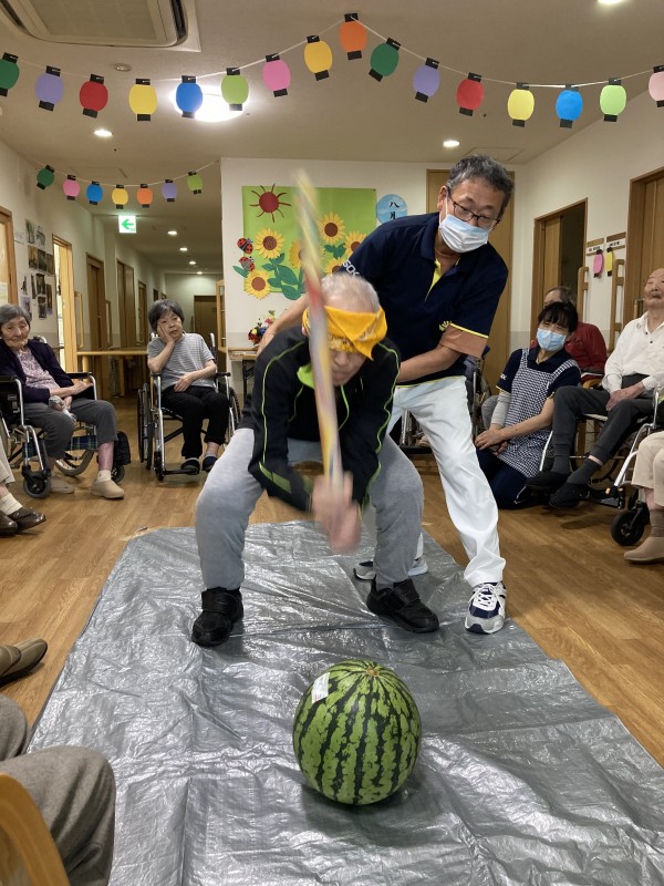 スタッフもお手伝いをさせて頂き、ご利用者様にはスイカ割りに参加して頂きました。