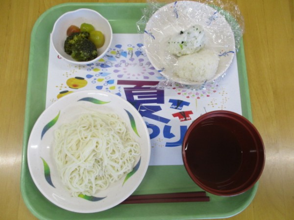 昼食の様子です。おにぎり・そうめん・トマトとブロッコリのハチミツ付けを作り召し上がられていました。美味しいね、こんなの食べたことないよ・・と完食し満足されていました。