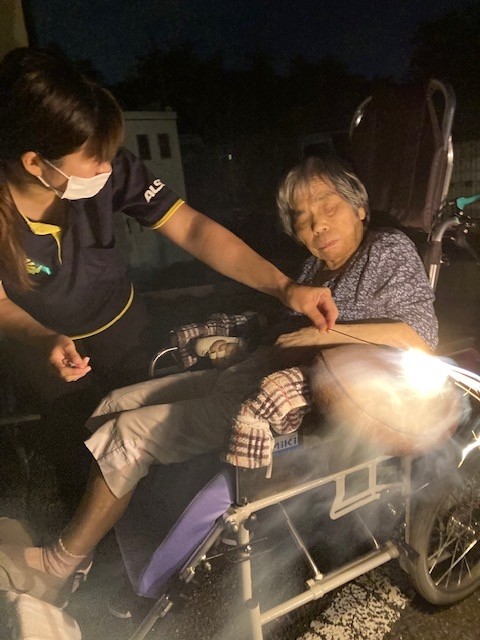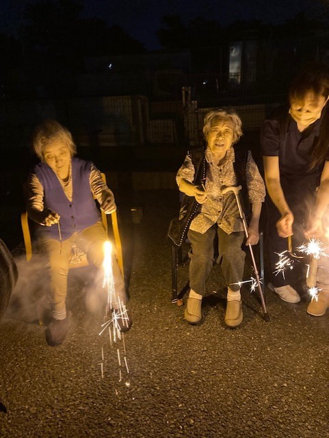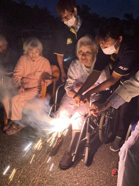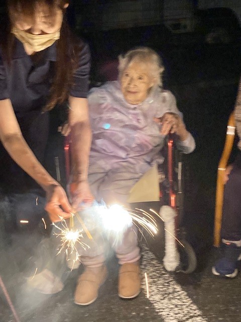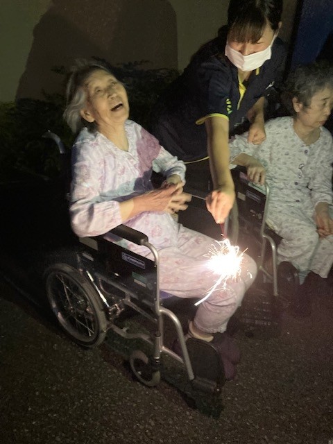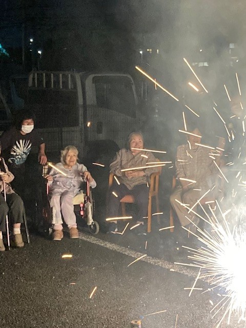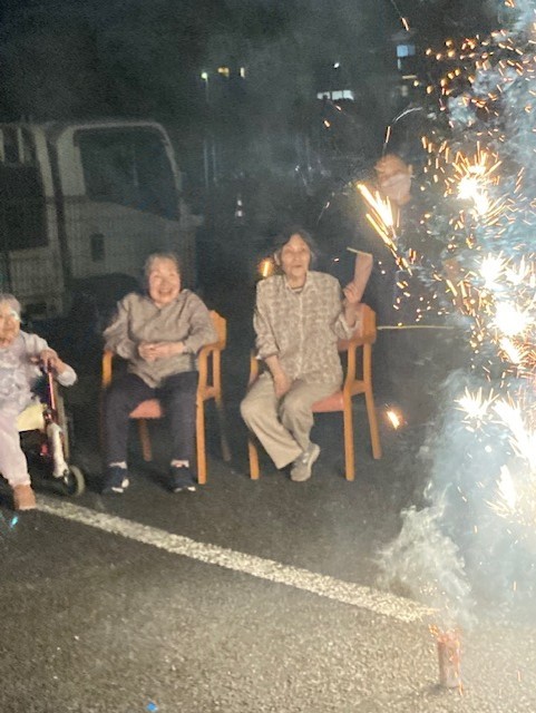 手持ち花火では花火を持つことを怖がる利用者様もいましたが多くの利用者様は「綺麗!綺麗!」と話され喜ばれていました。