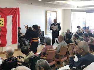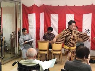 今日は入居者様の前で自慢の歌声を披露しています。