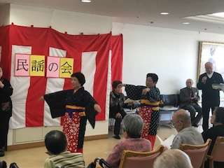 本日は新年イベントで何やら騒がしいですね~おや、あちらにいらっしゃるのはボランティアの民謡の会の皆様