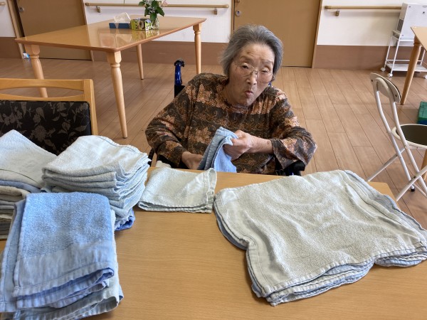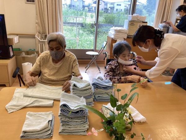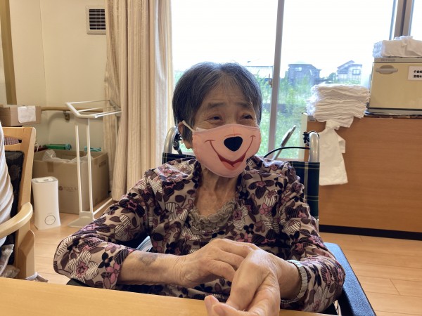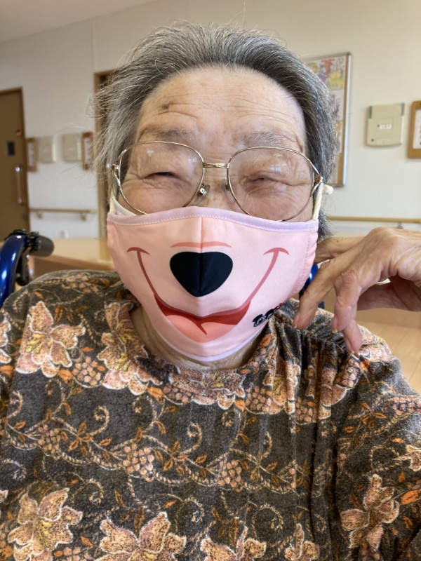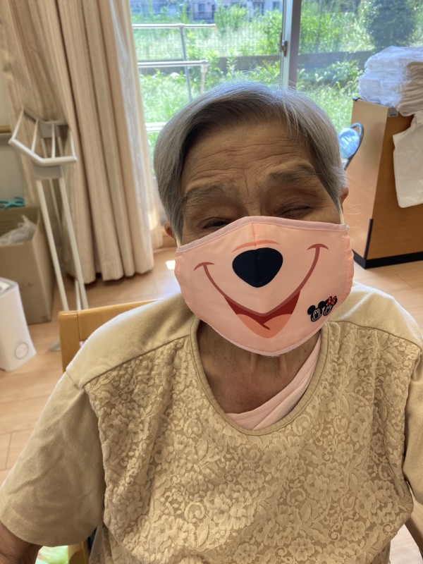 ホーム長がとっても可愛いマスクを持ってきました。実はこれ、ミッキーマウスの鼻と口なんです(^ω^)「入居者様がつけたらとっても似合うんじゃないかしら???」と、フロアにいらっしゃる方々に可愛いマスクをつけ始めました。
