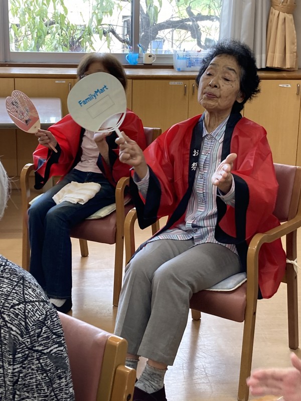 体操教室とは違った雰囲気で、初の試みだったこともあり、最初は戸惑っていらしたご入居者様も、夏祭りの時に耳なじみがある音楽も流れ、楽しく自然に身体が動いたご様子でした。最近ご入居されたご利用者様も、雰囲気を楽しんで、身体を動かしてくださいました。