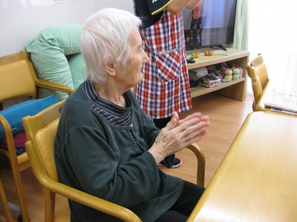 ビデオを見ながらゆっくりと体操に参加されています。ちょっとお疲れのご様子・・!!