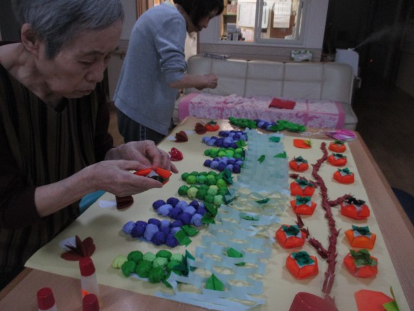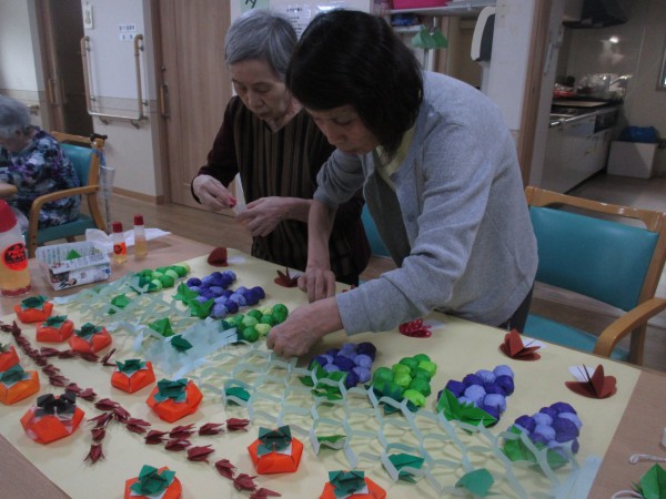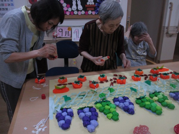 ぶどうや柿を折り紙で作り、飾り付けていただきました。