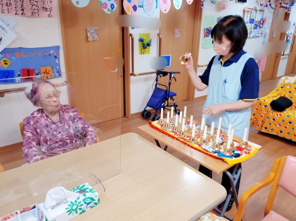 愛の賛歌、 happyBirthday to youの2曲をなんとケアスタッフ1人で見事にミュージックベルで演奏して下さいました。
