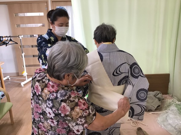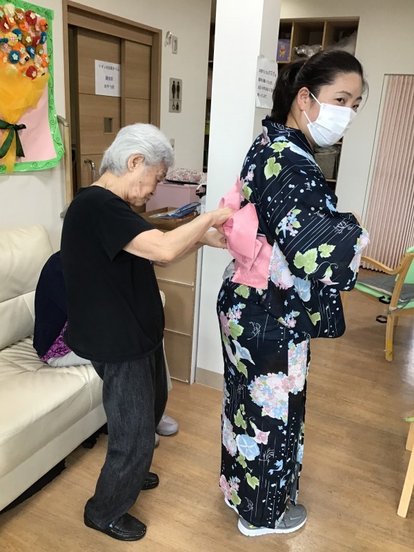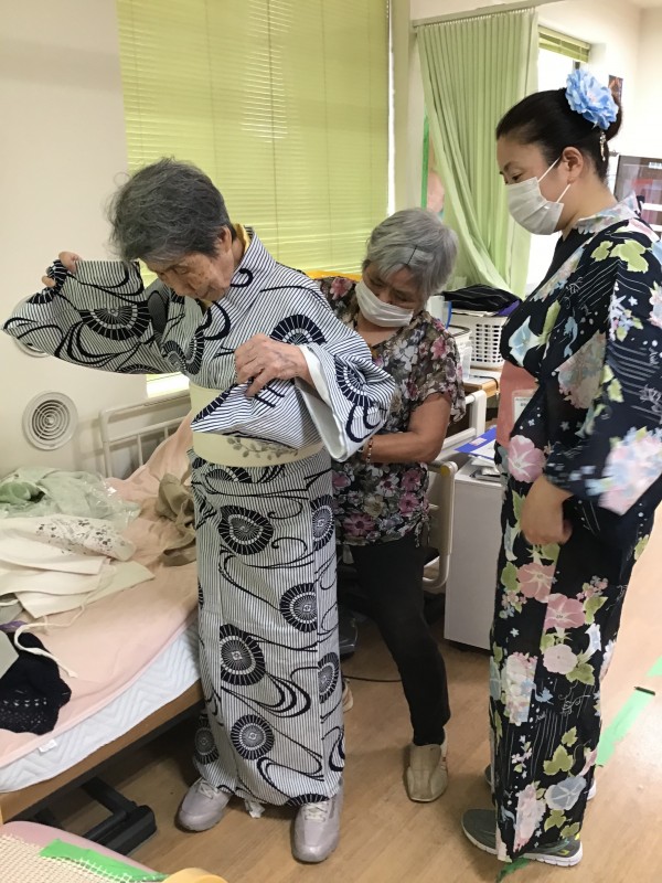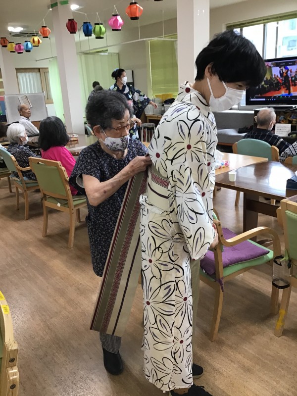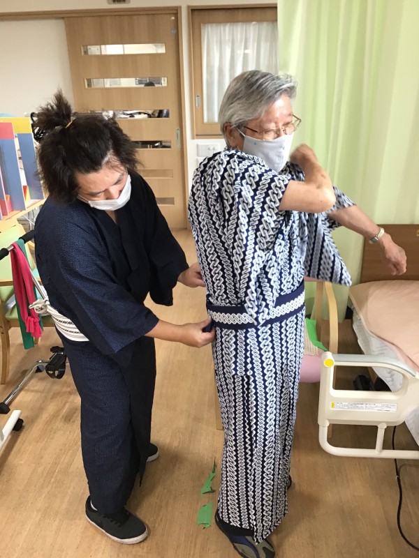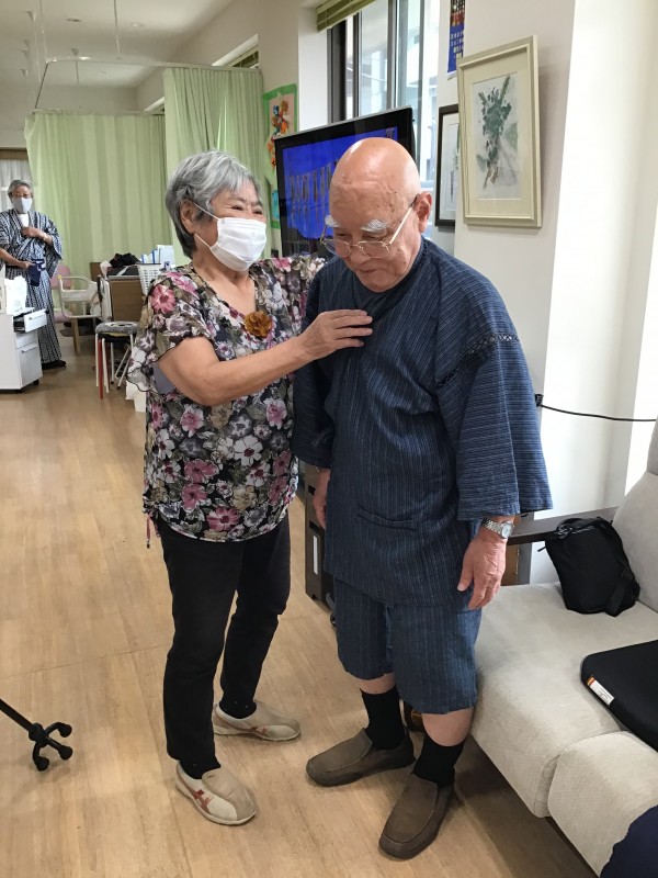 「浴衣着てきていいんでしょ?」というご利用者様のお言葉から火がつき、浴衣をお持ちの方、甚兵衛をお持ちの方にお持ち頂き、職員も含め着ちゃいました!