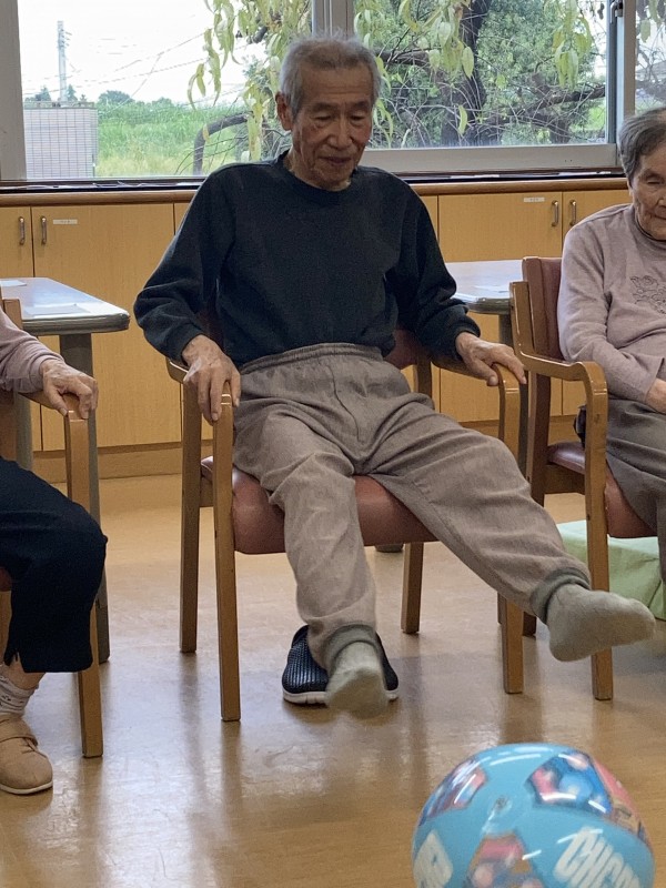 昨日のレクリエーションはボールを使ったレクリエーションを行いました。安全を考慮しながら靴を脱いでいただき、床に足がつく形で楽しくボールを蹴って回していました!