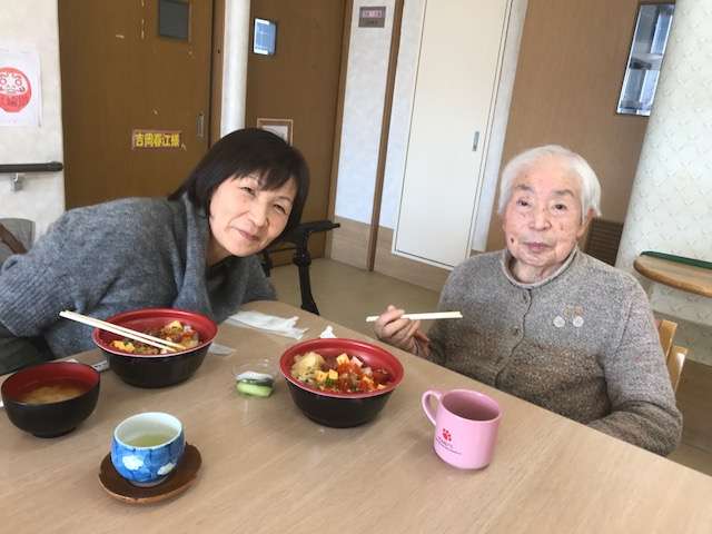 新年会ではがってん食堂のばらちらしを注文し、ご家族様と一緒に食べ、皆様「おいしいな」「これはおいしいね」といつもより食事が進んでおりました。そのあと、ご家族様と職員が集まりホームの概要をお伝えし意見交換を行いました。その際にこのブログのこともお話させていただきました。この記事も読んでいただけているかも(*^^)v