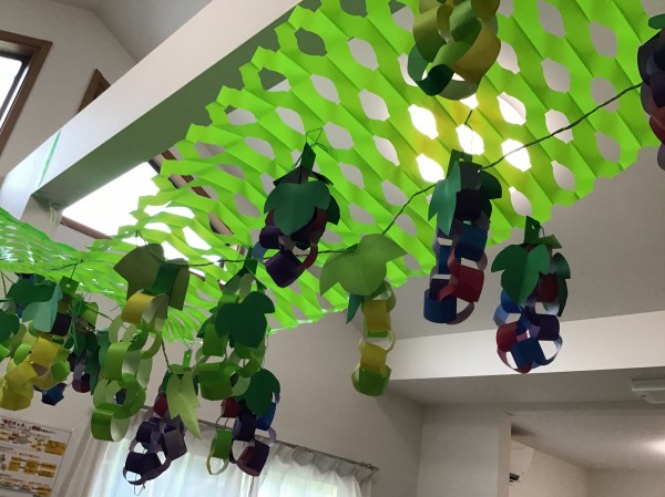 紫や黄緑色、時には???というような、きれいな折り紙も仲間入りしていますが、色とりどりのぶどうができあがり、