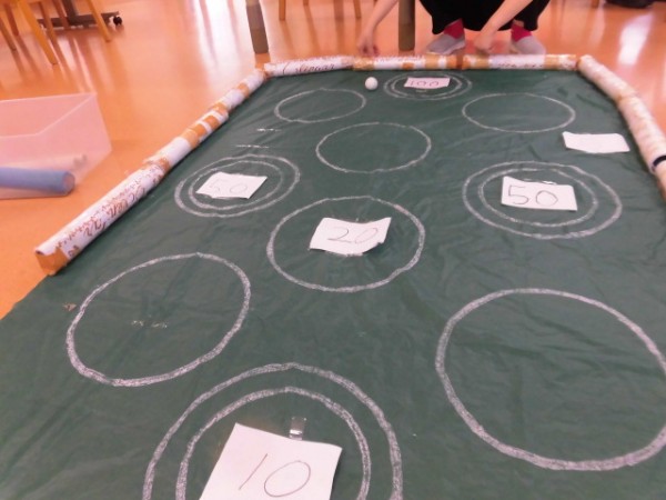 しばらくぶりにやるパターゴルフですね。今回は点を競い合って行きました。高得点の〇のところまで球を転がしていけるでしょうか?