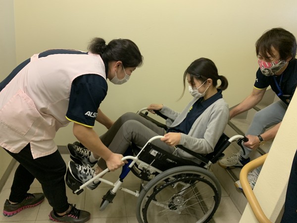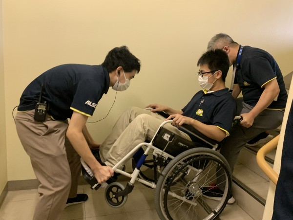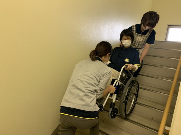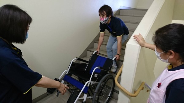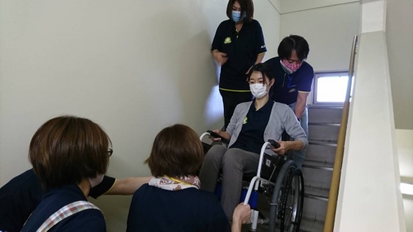台風や大雨で川が決壊するのを想定して車椅子の利用者様が階段で上に避難する設定です。