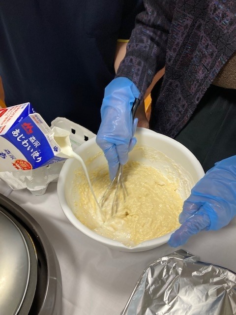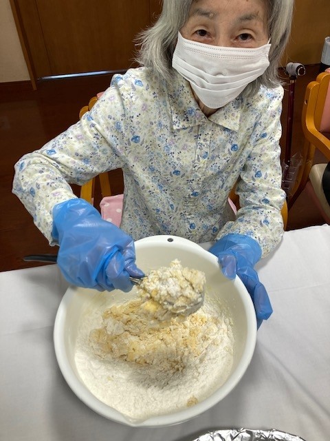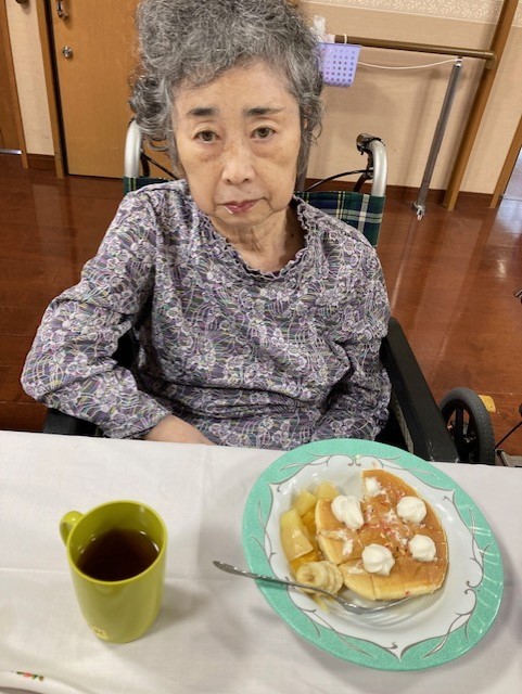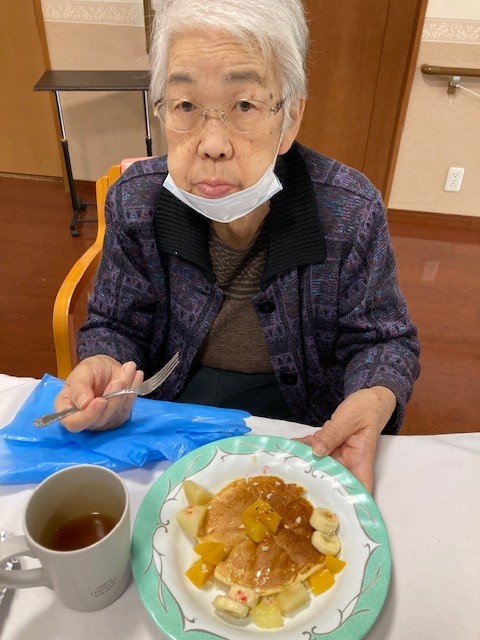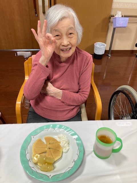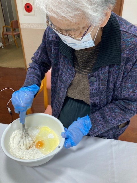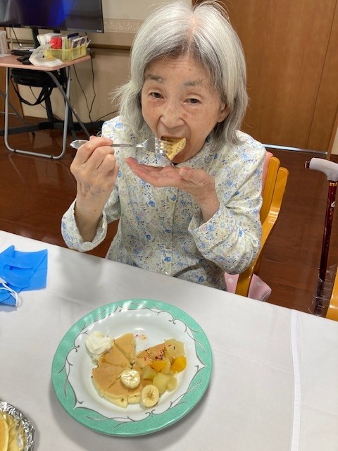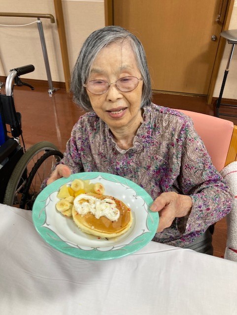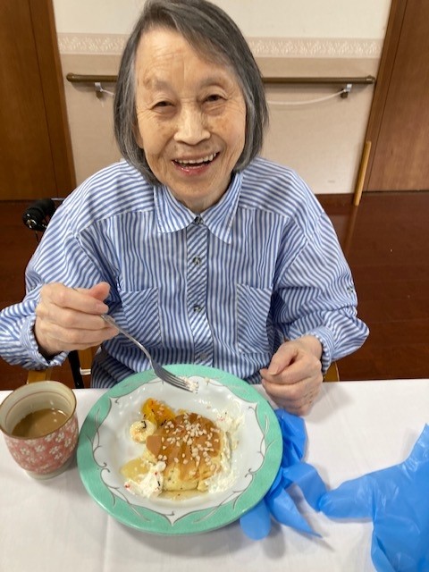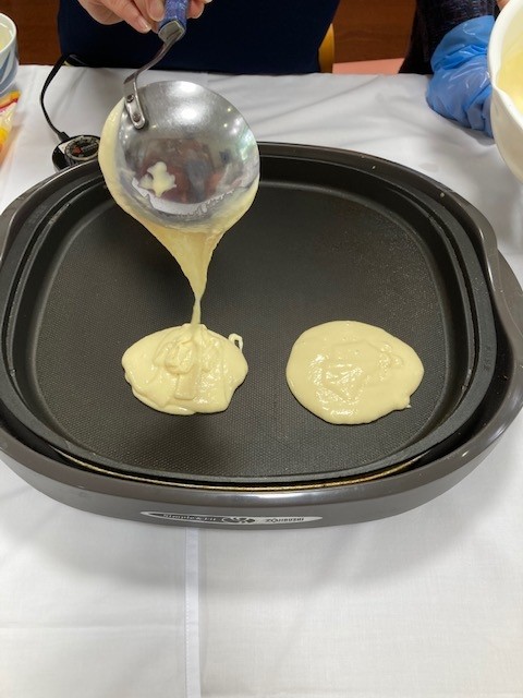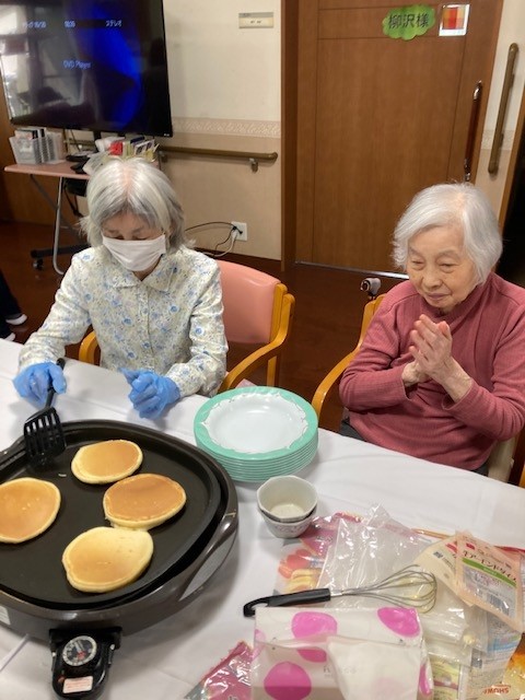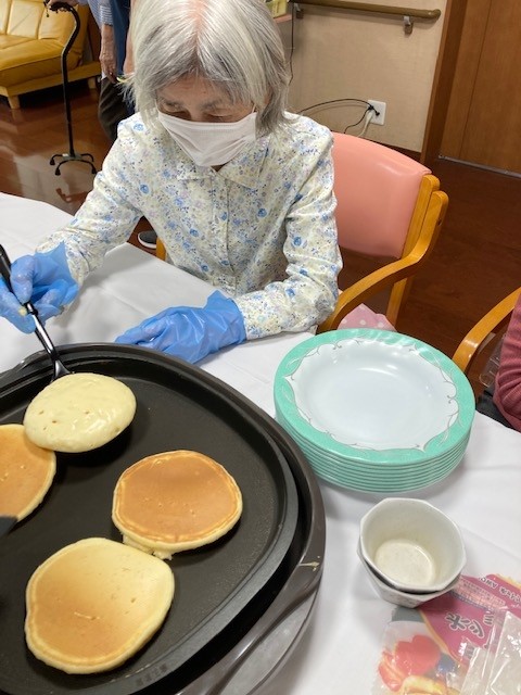 2階の敬老会ではホットケーキ作りをしました