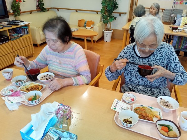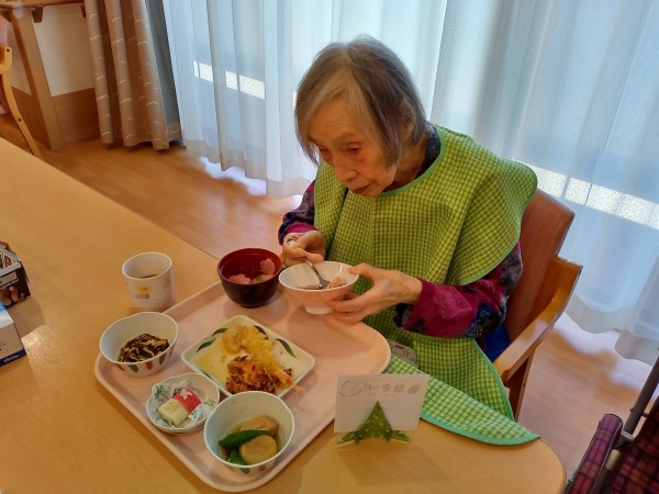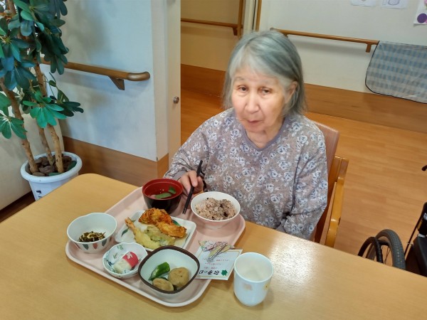 お昼には天ぷら御膳をお出ししました♪鶴の絵の入った白あんの紅白のお菓子がかわいくて好評でした!