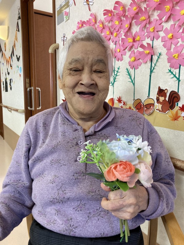 とてもいい笑顔ですね。花束もかわいいです!