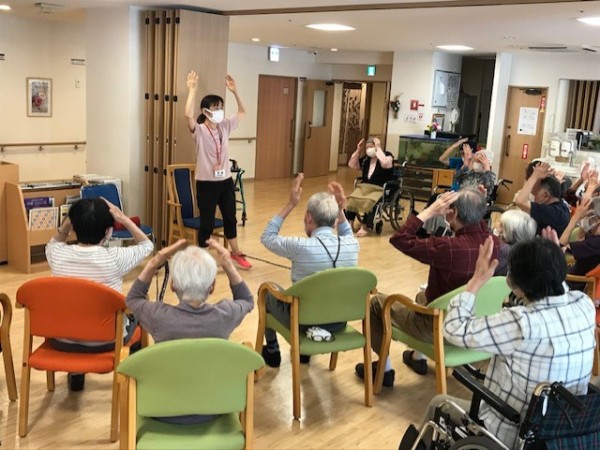 毎月恒例の健康コンテンツの運動があり、皆様元気良く参加されていました。ヾ(*´∀`*)ノ