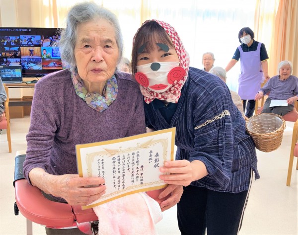 ホーム長から表彰状を受け取ると「ありがとうございます…!」と感極まったご様子のW様。