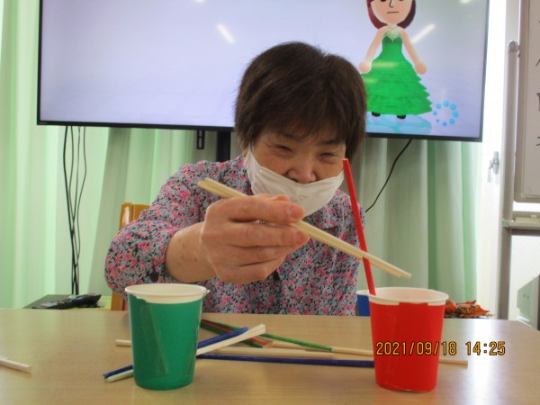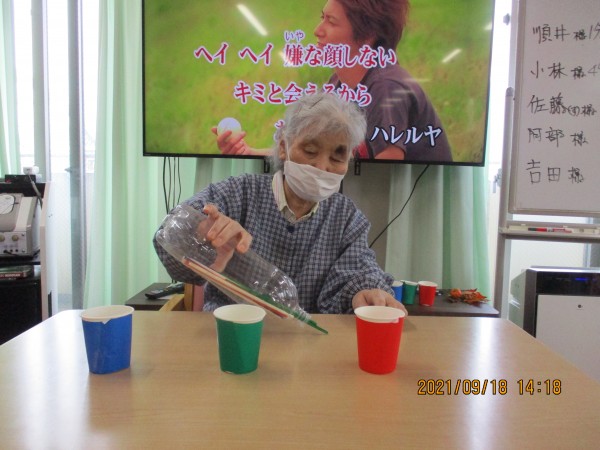 シェイク・シェイクという名のゲームです。ペットボトルに色分けしたはしを入れて、逆さまにして、箸をだし、色分けしたコップにそのいろの箸を入れてタイムを競うゲームです。中々難しいですよ(*'ω'*)