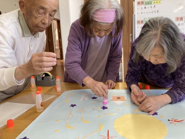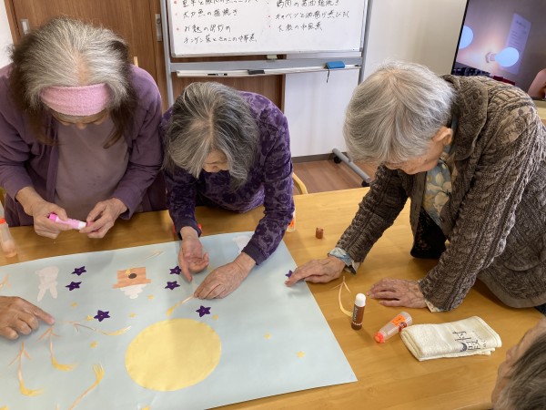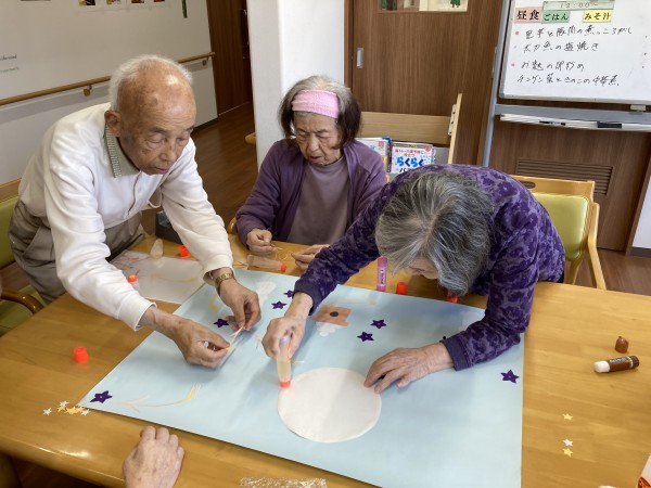 こんにちは!グループホームみんなの家・あきがせの介護ブログです。よろしくお願いいたします。中秋の名月です。貼り絵を行いました!!力作が完成しました。