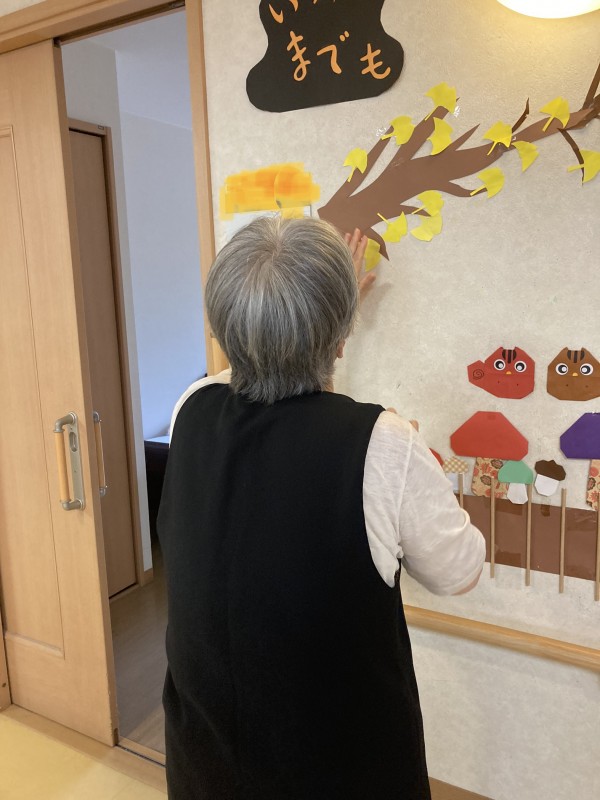 「どこにしようかしら」と言いながらも始めると楽しそうな様子。素敵に彩られていく壁飾りで秋を楽しみます♪